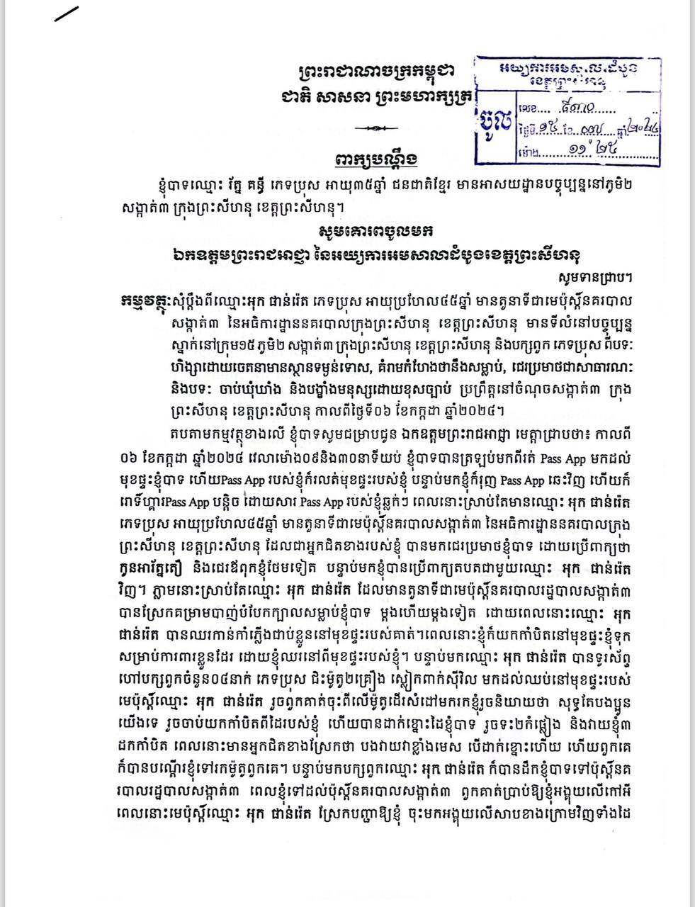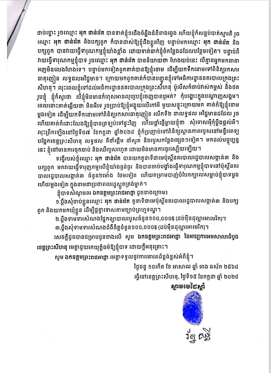 ដោយរងនូវភាពឈឺចាប់ និងអយុត្តិធម៌ពេកព្រោះប្រទេសមានច្បាប់ បទល្មើសមានម្ចាស់ លោក រត្ន័ គន្ធី ថា គាត់ក៏បានសម្រេចដាក់ពាក្យបណ្តឹងទៅ តំណាងអយ្យការ សាលាដំបូងខេត្តព្រះសីហនុ កាលពីថ្ងៃទី១៥ ខែកក្កដា ឆ្នាំ២០២៤ ទៅអភិបាលខេត្តថ្ងៃទី២៩ ខែឆ្នាំដដែល និងទៅអគ្គស្នងការនគរបាលជាតិ ឯកឧត្តម សថេត ថ្ងៃទី០១ ខែសីហា ឆ្នាំ២០២៤ ជនរងគ្រោះថា