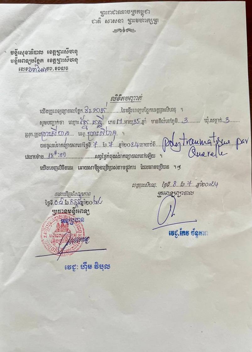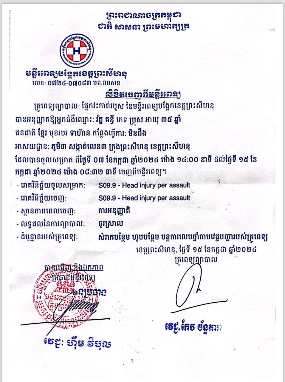 បើតាមបទសម្ភាសន៍ បានឲ្យដឹងថា ដើមហេតុនៃជម្លោះគឺរឿង ផាស់ស្អែបឈ្លក់សាំង ជនរងគ្រោះបញ្ឆេះហើយរោហ្គា នៅជិតផ្ទះលោកមេប៉ុស្តិ៍ទើបលោកមេប៉ុស្តិ៍ជេរប្រមាថមើលងាយថានិងគំរាមបាញ់សម្លាប់ ទើបបង្កើតជាជម្លោះ កាលពីម៉ោង៩ជាងយប់ថ្ងៃទី៦ កក្កដា ឆ្នាំ២០២៤ នៅខាងក្រោយសាលាអនុវិទ្យាល័យ សម្តេចឪស្ថិតក្នុងភូមិ២ សង្កាត់លេខ៣ ក្រុង/ខេត្តព្រះសីហនុ ។ ក្រោយកើតហេតុ ដោយសារស្ថានភាពរបួសឈឺចុកចាប់ខ្លាំង ក្អកធ្លាក់ឈម នៅព្រឹកថ្ងៃទី៧ ជនរងគ្រោះត្រូវបានក្រុមគ្រួសារបញ្ជូនទៅមន្ទីរពេទ្យបង្អែកខេត្តព្រះសីហនុ ដោយពិនិត្យឃើញរបួសធ្ងន់ ហើមថ្លើមហើមសួត អាចគ្រោះថ្នាក់ដល់អាយុជីវិតទើបគ្រូពេទ្យផ្នែកវះកាត់ឲ្យសម្រាកព្យាបាល តាមដានអស់រយៈពេល១០ថ្ងៃ នេះបើយោងតាមលិខិតបញ្ជាក់របស់មន្ទីរពេទ្យបង្អែកខេត្តព្រះសីហនុ។