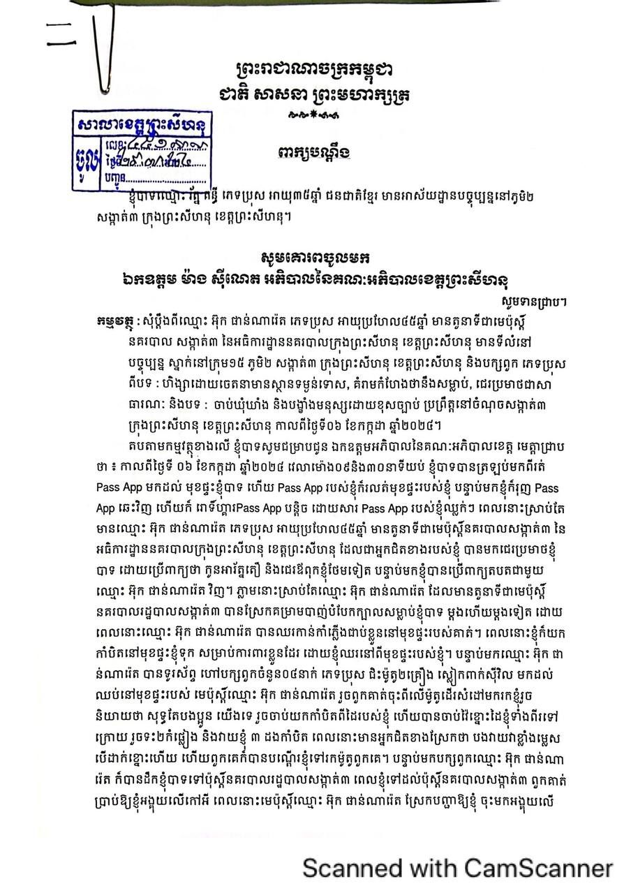 ខេត្តព្រះសីហនុ៖ ករណីលោកវរសេនីយ៍ត្រី អ៊ុក ផាន់ណារ៉េត នាយប៉ុស្តិ៍រដ្ឋបាល សង្កាត់លេខលេខ៣ ក្រុងព្រះសីហនុ ប្រើអំពើហិង្សា ចាប់វ៉ៃខ្នោះទាត់ធាក់លើជនរងគ្រោះ ឈ្មោះ រ័ត្ន គន្ធី (អ្នករត់ផាស់អ៊ែប)កាលពីយប់ថ្ងៃទី១៦ ខែកក្កដាឆ្នាំ២០២៤ ត្រូវបាន អយ្យការសាលាដំបូងខេត្តព្រះសីហនុឲ្យលោកអ៊ុកផាន់ណារ៉េត ចូលបំភ្លឺនៅថ្ងៃទី១៣ ខែសីហា ឆ្នាំ២០២៤ នេះហើយ តាមបណ្តឹងជនរងគ្រោះ។