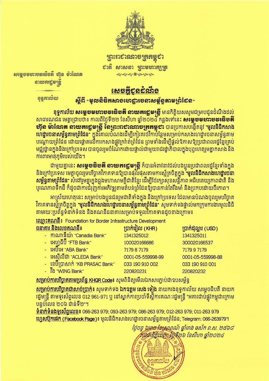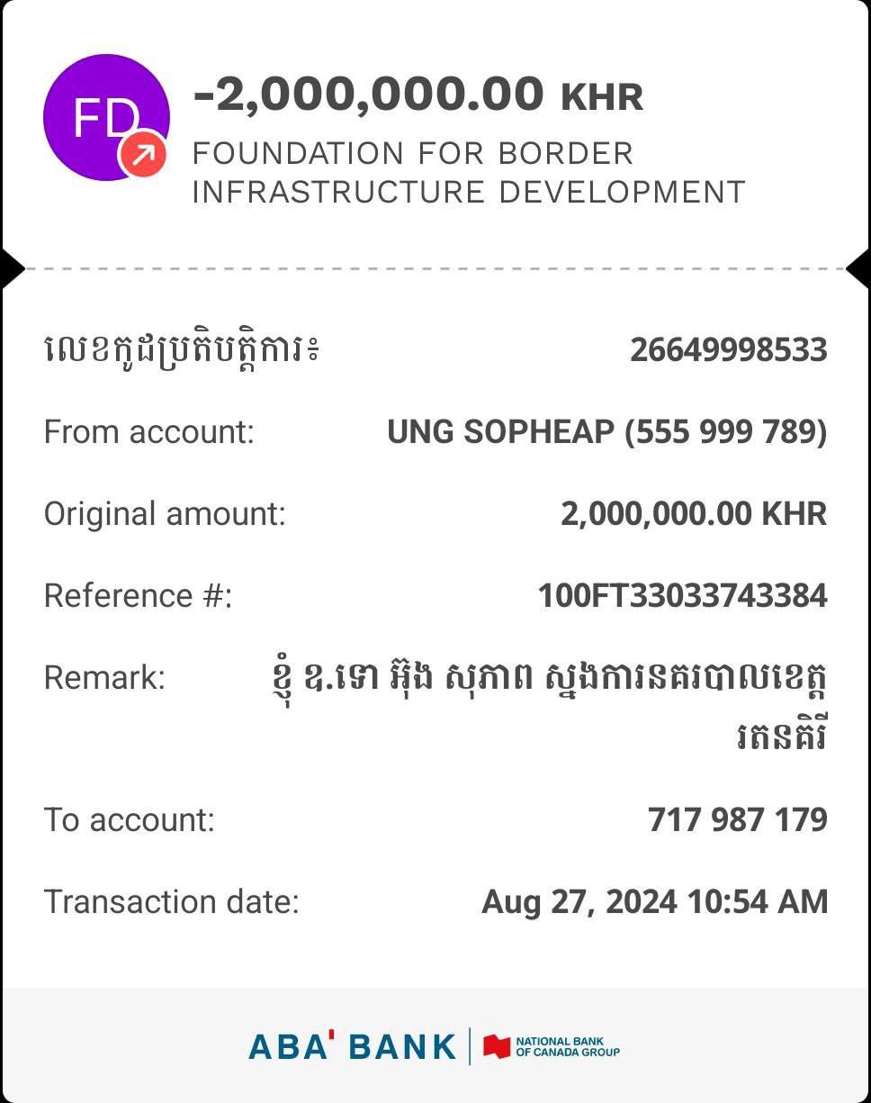 លោកឧត្ដមសេនីយ៍ទោ អ៊ុង សុភាព ស្នងការ នៃស្នងការរដ្ឋាននគរបាលខេត្តរតនគិរី ព្រមទាំងក្រុមគ្រួសារ បានបរិច្ចាកថវិកាចំនួន ២លានរៀល ក្នុងការកសាងហេដ្ឋារចនាសម្ព័ននានា តាមបន្ទាត់ព្រំដែន។ មូលនិធិកសាងហេដ្ឋារចនាសម្ព័នតាមបណ្ដោយព្រំដែននេះ គឺ ជាគំនិតផ្ដួចផ្ដើមដ៏ឈ្លាសវៃរបស់សម្ដេចបវរធិបតី ហ៊ុន ម៉ាណែត នាយករដ្ឋមន្ត្រី នៃព្រះរាជាណាចក្រកម្ពុជា ជាប្រយោជន៍ការពារបូរភាពទឹកដី និងជាប្រយោជន៍សម្រាប់ចរន្តសេដ្ឋកិច្ចរបស់ប្រជាជនកម្ពុជាផងដែរ។ (ដោយ ភួង ផុន)