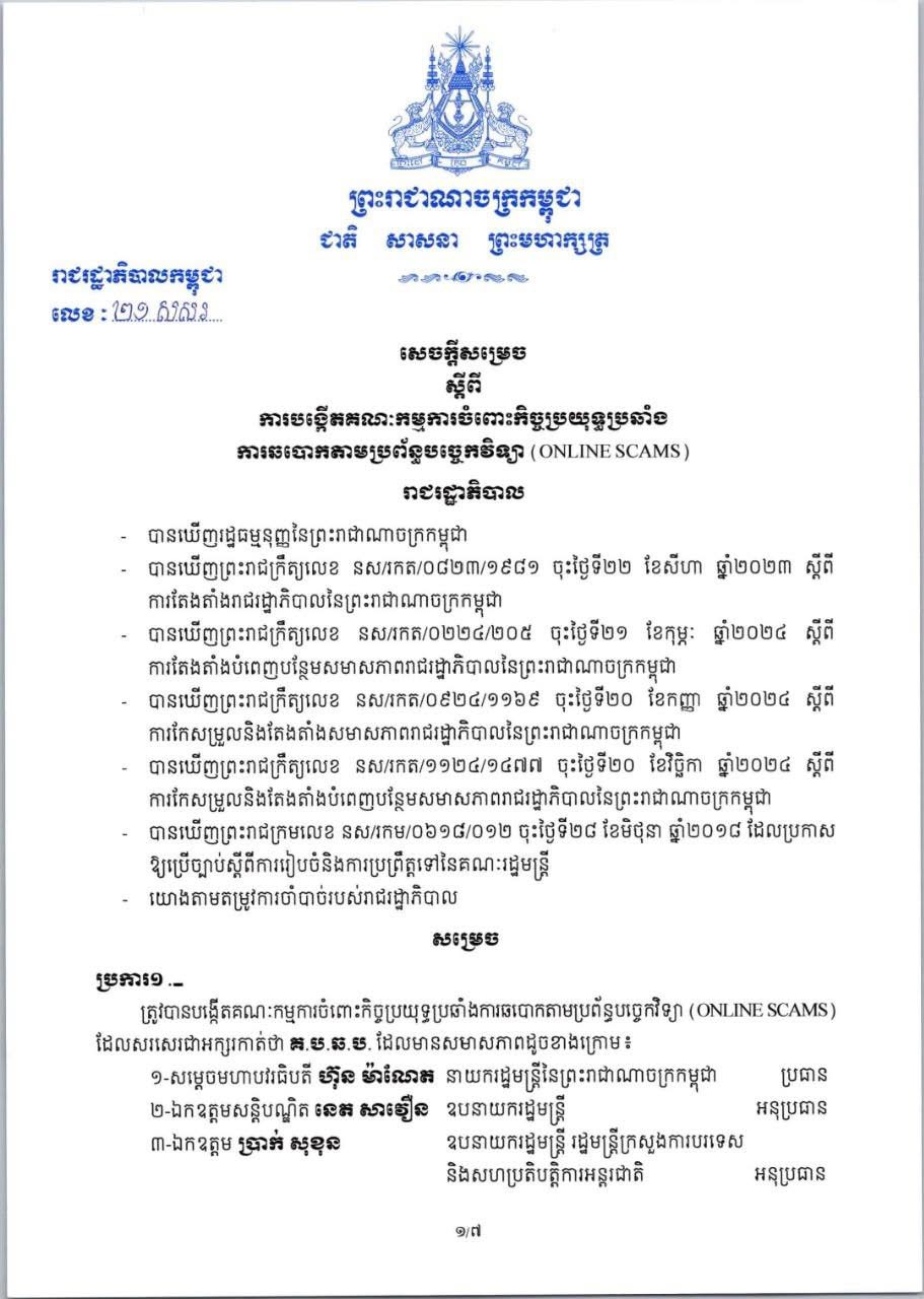 (ភ្នំពេញ)៖ ប្រមុខរាជរដ្ឋាភិបាលកម្ពុជា សម្តេចមហាបវរធិបតី ហ៊ុន ម៉ាណែត នៅថ្ងៃទី២០ ខែកុម្ភៈ ឆ្នាំ២០២៥ បានចេញសេចក្តីសម្រេចបង្កើតគណៈកម្មការចំពោះកិច្ចប្រយុទ្ធប្រឆាំងការឆបោកតាមប្រព័ន្ធបច្ចេកវិទ្យា (ONLINE SCAMS)។ នេះបើតាមសេចក្តីសម្រេចដែលបណ្តាញព័ត៌មាន Fresh News ទទួលបាននៅថ្ងៃទី២៤ ខែកុម្ភៈនេះ ។