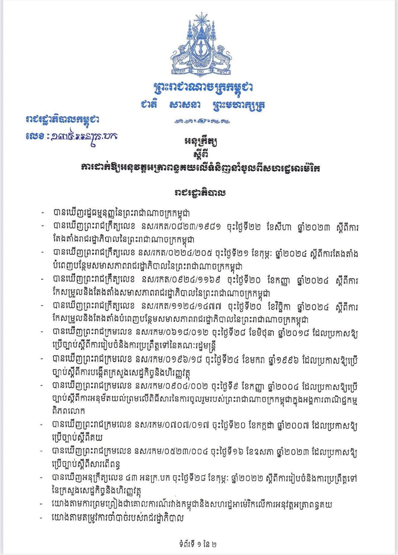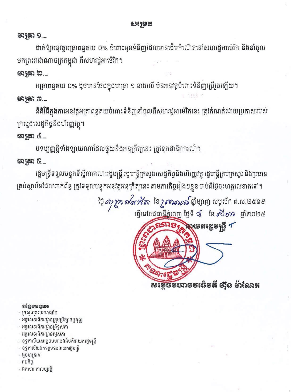 ការអនុវត្តអត្រាពន្ធគយ ០% លើទំនិញរបស់សហរដ្ឋអាម៉េរិក រាជរដ្ឋាភិបាលកម្ពុជាចេញអនុក្រឹត្យ លេខ១៣៩ អនក្រ.ប្រក-ចុះថ្ងៃទី៨សីហា២០២៥ ដែលចចុះហត្ថលេខាដោយនាយរដ្ឋមន្ត្រី សម្តេចមហាបវរធិបតី ហ៊ុន ម៉ាណែត៕