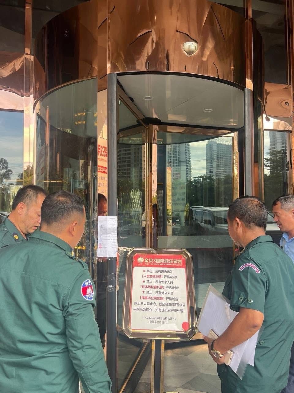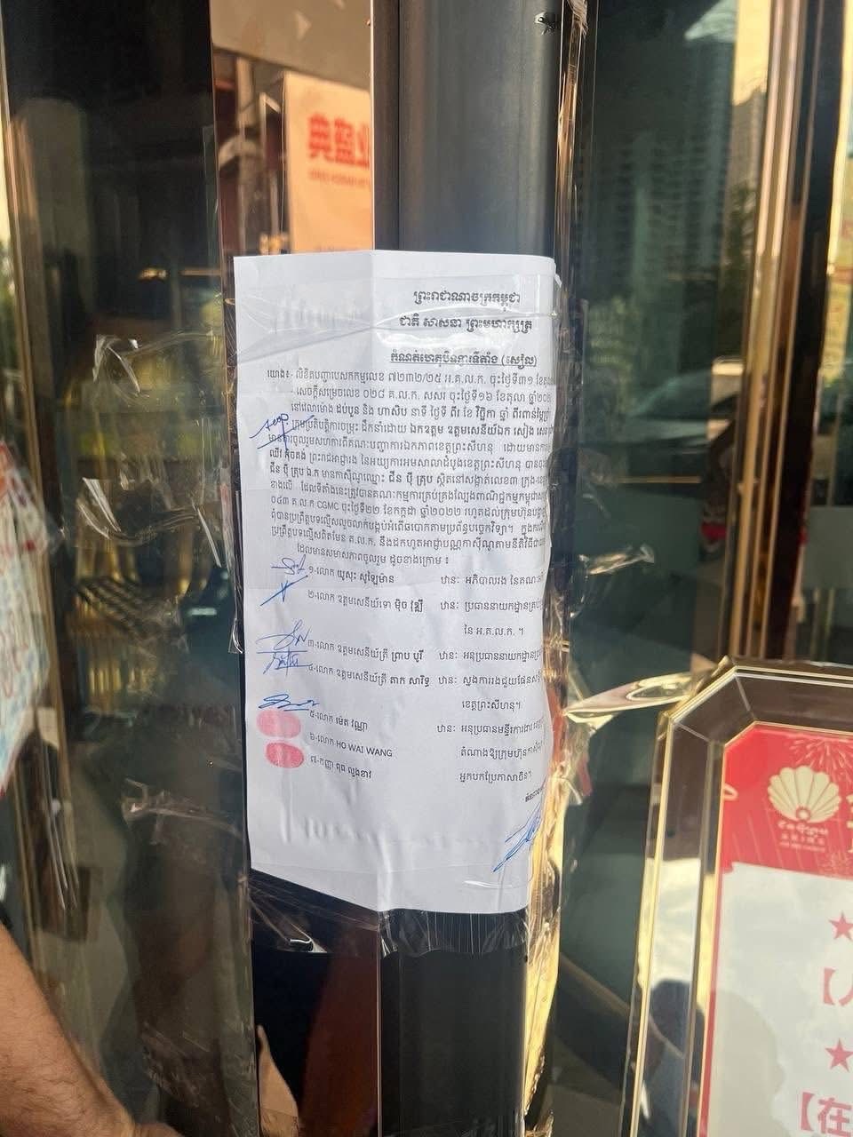 ខេត្តព្រះសីហនុ – ដោយអនុវត្តតាមបទបញ្ជាលេខ ០១ បប របស់រាជរដ្ឋាភិបាល ស្តីពីយុទ្ធនាការបោសសម្អាតការឆបោកតាមប្រព័ន្ធបច្ចេកវិទ្យា នៅថ្ងៃទី២ ខែវិច្ឆិកា ឆ្នាំ២០២៥ វេលាម៉ោង ៩:០០ នាទីព្រឹក ក្រុមការងាររបស់អគ្គលេខាធិការដ្ឋាននៃ គ.ល.ក. និងអគ្គស្នងការដ្ឋាននគរបាលជាតិ ដឹកនាំដោយ ឧត្តមសេនីយ៍ឯក សៀង សេន អគ្គលេខាធិការរង គ.ល.ក. សហការជាមួយរដ្ឋបាលខេត្តព្រះសីហនុ ស្នងការដ្ឋាននគរបាលខេត្តព្រះសីហនុ មន្ទីរការងារខេត្តព្រះសីហនុ ដែលដឹកនាំនិងសម្របសម្រួលនីតិវិធីដោយ លោក ឈីវ អុិចគង់ ព្រះរាជអាជ្ញារង នៃអយ្យការអមសាលាដំបូងខេត្តព្រះសីហនុ បានចុះផ្អាក និងបិទអាជីវកម្ម (បិទ Seal) កាស៊ីណូចំនួន4 នៅខេត្តព្រះសីហនុ