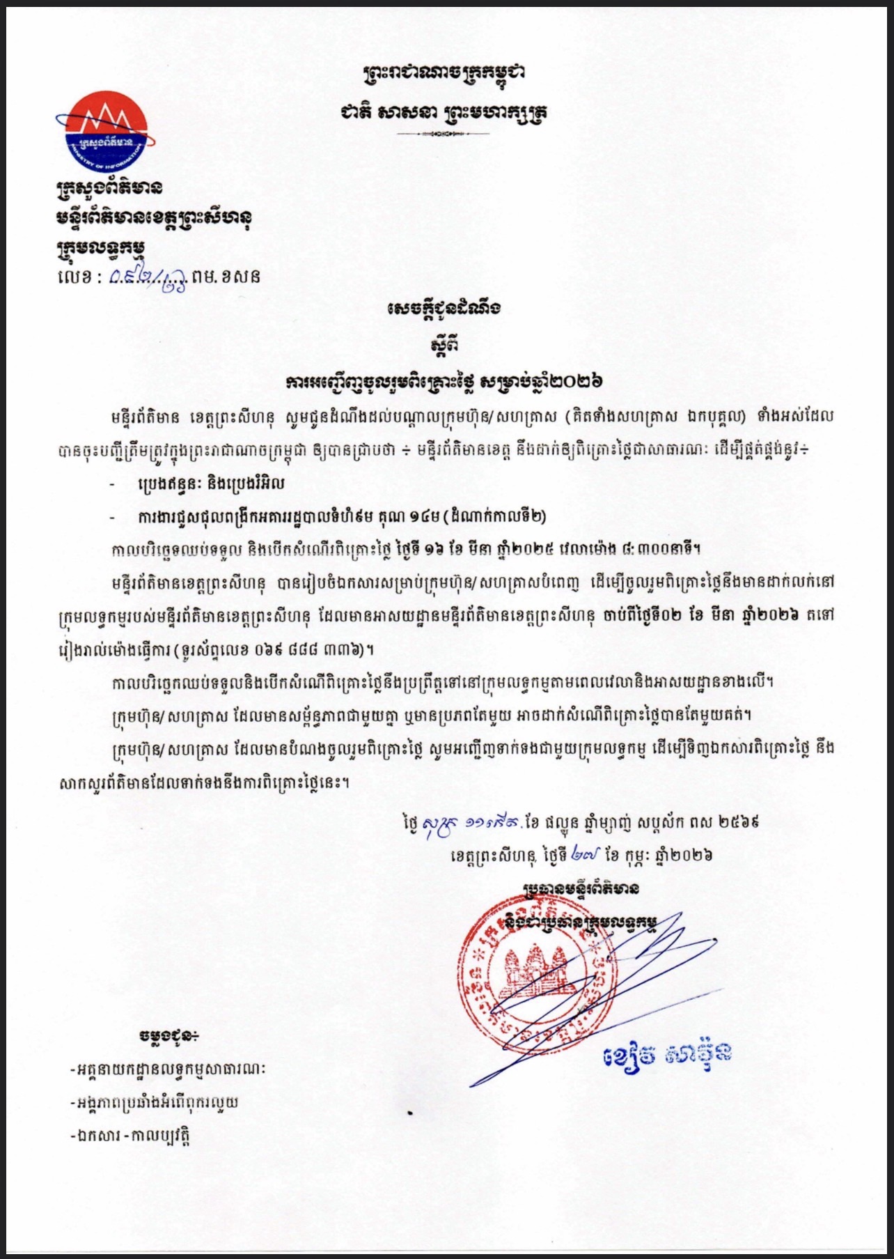 មន្ទីរព័ត៌មានខេត្តព្រះសីហនុ បានរៀបចំឯកសារសម្រាប់ក្រុមហ៊ុន/ សហគ្រាសបំពេញ ដើម្បីចូលរួមពិគ្រោះថ្លៃនឹងមានដាក់លក់នៅក្រុមលទ្ធកម្មរបស់មន្ទីរព័ត៌មានខេត្តព្រះសីហនុ ដែលមានអាសយដ្ឋានមន្ទីរព័ត៌មានខេត្តព្រះសីហនុ ចាប់ពីថ្ងៃទី០២ ខែមីនា ឆ្នាំ២០២៦ តទៅរៀងរាល់ម៉ោងធ្វើការ (ទូរស័ព្ទលេខ ០៦៩ ៨៨៨ ៣៣៦)។