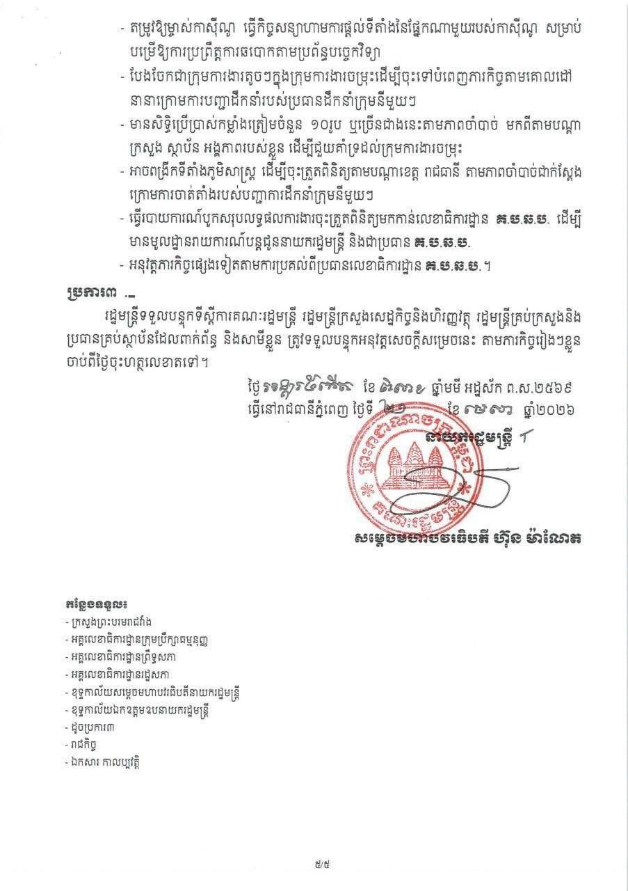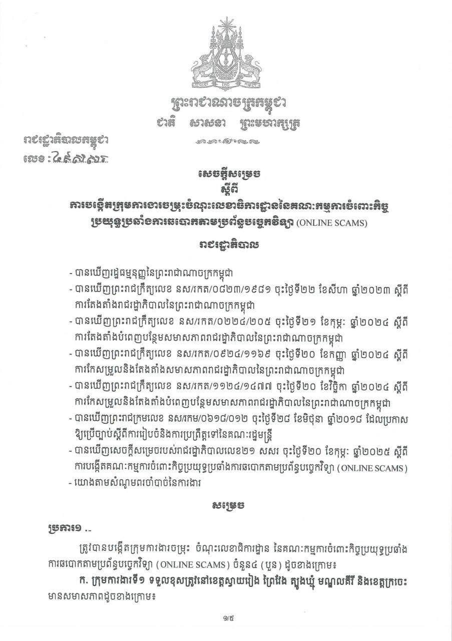 រាជរដ្ឋាភិបាល កម្ពុជាបានសម្រេចបង្កើតក្រុមការងារចម្រុះចំណុះលេខាធិការដ្ឋាន គ.ប.ឆ.ប. បង្ក្រាប និងបោសសម្អាតការឆបោកតាមប្រព័ន្ធបច្ចេកវិទ្យា ២១.៤.២០២៦